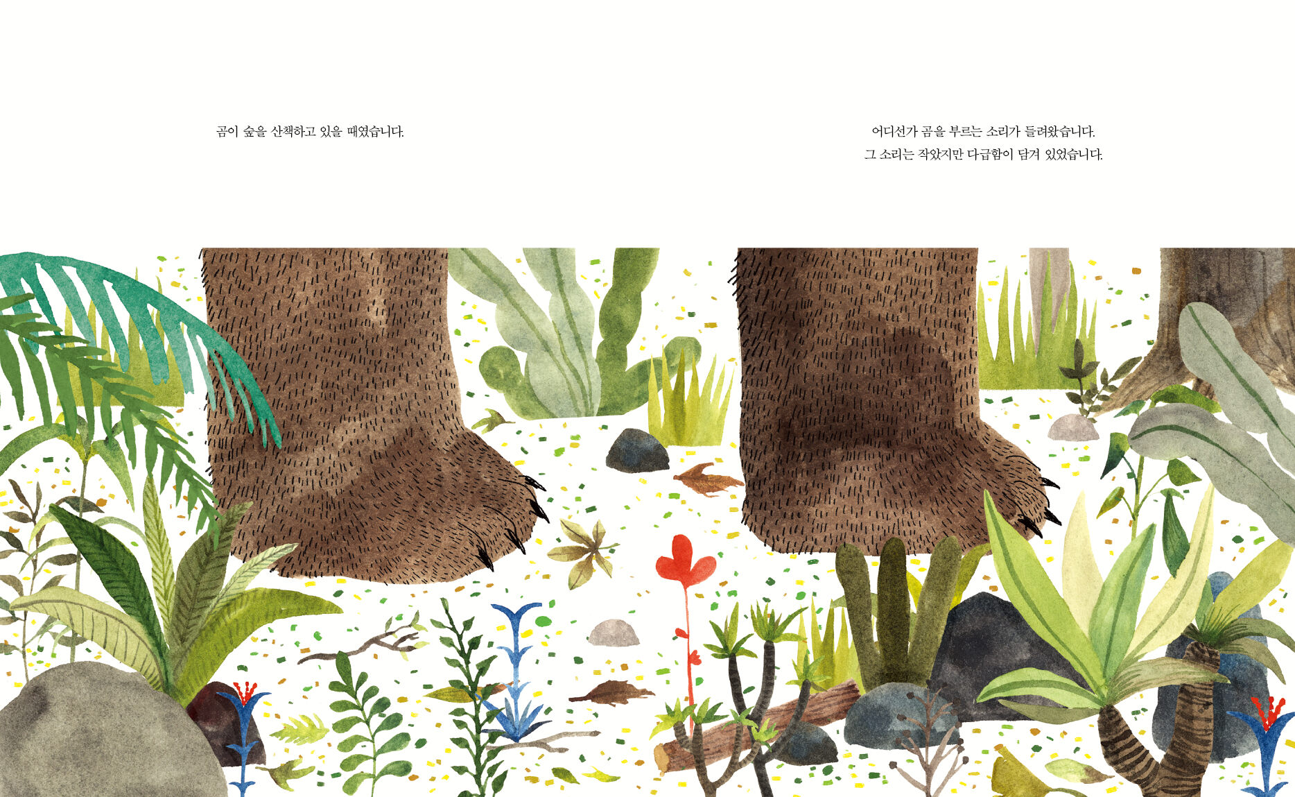 곰은 고민 끝에 결국 무당벌레를 구해 준다. 강경수 작가는 손끝으로 거미줄을 끊는 것과 같이 아주 사소한 행동일지라도 그것이 세상에 커다란 변화를 일으킬 수 있다는 생각에서 이 이야기를 시작했다. 살아난 무당벌레 덕분에 이듬해 봄, 들판에는 수많은 꽃이 핀다. 꽃이 만발한 들판에서 곰이 경이감을 느끼는 결말에 작가가 가장 하고 싶은 말이 담겨 있다. 인간은 때때로 아첨하고, 거짓말을 하고, 위선적이기도 하지만, 그럼에도 불구하고 어려움에 처한 타인을 돕고, 선의에 보답하려 하며 약속을 지키는 존재라는 믿음이 그것이다.