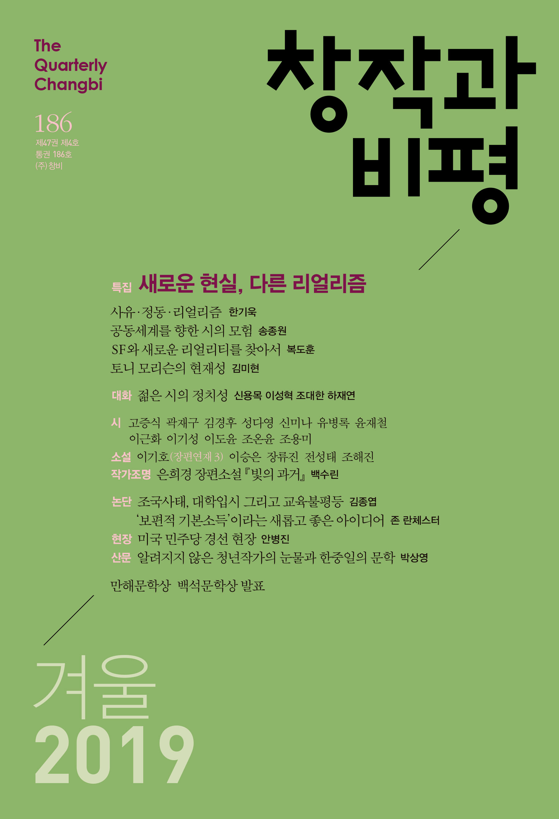 거론하는 것조차 새삼 피로감을 불러올지 모를 이른바 ‘조국사태’는 우리 사회가 당면한 다양한 과제를 일깨워주었다. 이 사태를 관통하는 핵심이 무엇인지를 두고서 의견이 분분할 수 있겠으나, 주요한 키워드로 ‘진실’을 꼽을 수 있을 것이다. 이제 진실은 발견되기보다 모색하고 논하고 구축해야 하는 일이 되었다. 진실이 무중력에 있거나 중립에 있지 않은 만큼 우리는 어떠한 입장과 위치를 가질 것인지 고민해야만 한다. 문학평론가이자 본지 편집위원인 황정아는 각자가 발 디딘 자리를 자각해본 근례로 촛불혁명을 참고하자고 말한다(「책머리에」). 그 어느때보다 집단적이고 열렬하게 우리가 합의했던 과제들을 다시금 굳건히 밀고 나가야 할 때다. 당장 시한이 다가온 선거법 개정안 패스트트랙과, 한치 앞을 내다보기 어려운 한반도 평화프로세스는 촛불혁명을 통해 ‘국정운영자’로 거듭나게 된 우리가 총체적인 사유로서 다루어야 할 사안일 것이다. 『창작과비평』은 한국사회가 당면한 과제를 직시하며 굳건한 자세로 다가올 2020년을 준비하고자 한다.