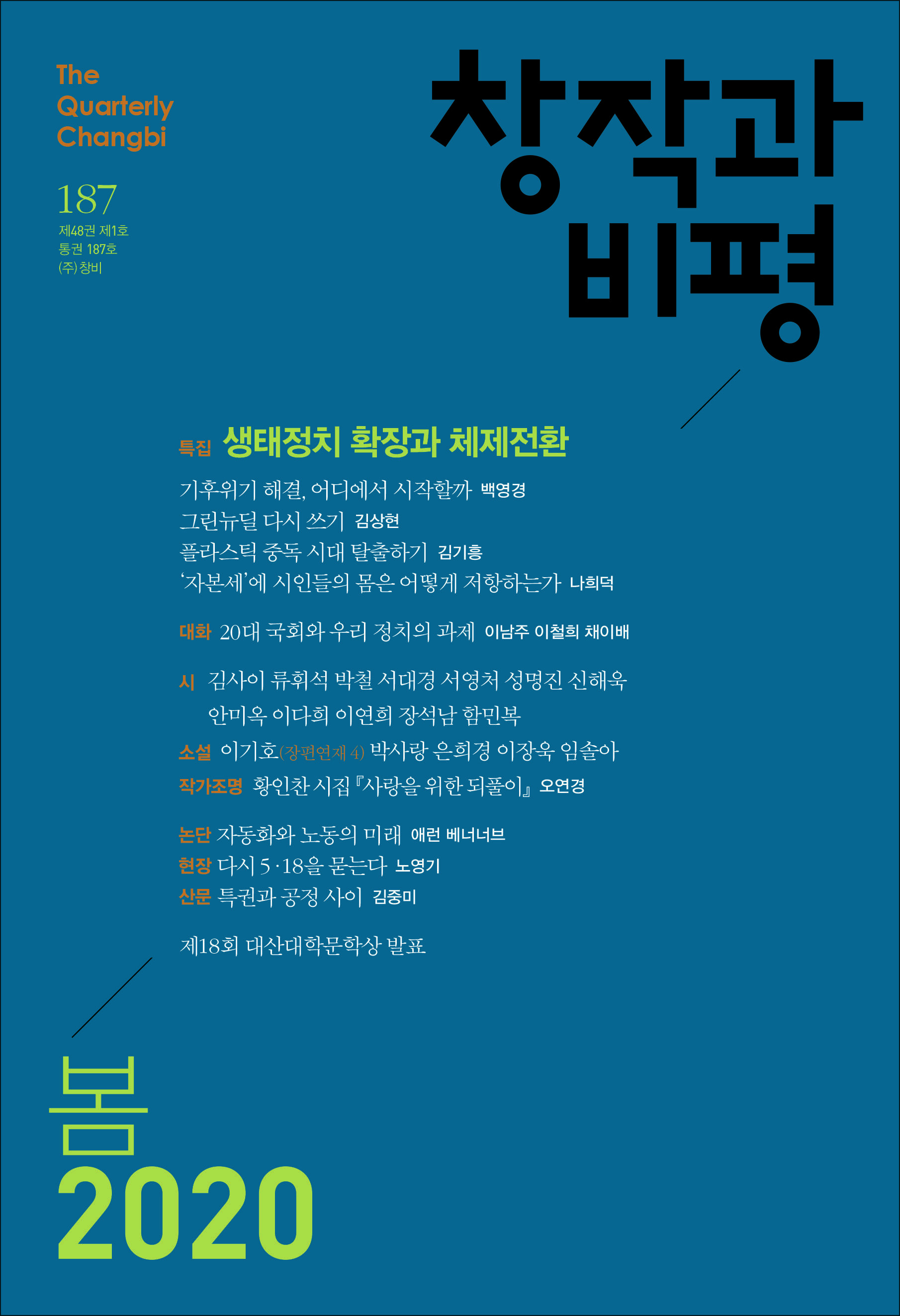 21대 총선을 앞두고 여당심판론과 야당심판론이라는 낡은 정치공학적 대립이 재연되고 있다. 온 국민을 불안에 떨게 한 코로나19마저 정쟁의 도구가 되는 갑갑한 현실을 넘어서기 위해서는 한층 너른 시야가 필요하다. 촛불혁명이 요구하는 대전환이란 단지 권력교체만을 의미하지 않으며, “다른 삶으로 나아가는 데 필요한 보다 근본적인 문제의식”(강경석 「책머리에」)을 포함한다는 점을 환기할 필요가 있다. 그러한 차원에서 이번호 특집은 전지구적 차원의 문제이자 일상의 영역에서도 해결을 미룰 수 없는 기후변화와 생태위기를 어떻게 인식하고 극복할 것인지 논한다. 신종코로나바이러스, 미세먼지, 후꾸시마 오염수, 아마존 화재, 호주 산불 등 얼핏 서로 무관한 듯 보이는 세계적 재난들은 사실 자본주의체제에 깊이 연루된 정치적 문제이기도 하다. 기후변화와 생태위기로 인해 ‘우리가 알던 세계’가 시시각각 달라지고 있는 지금, 생태정치의 확장을 모색하는 중요한 작업에 『창작과비평』도 담론적·실천적 힘을 보태고자 한다.